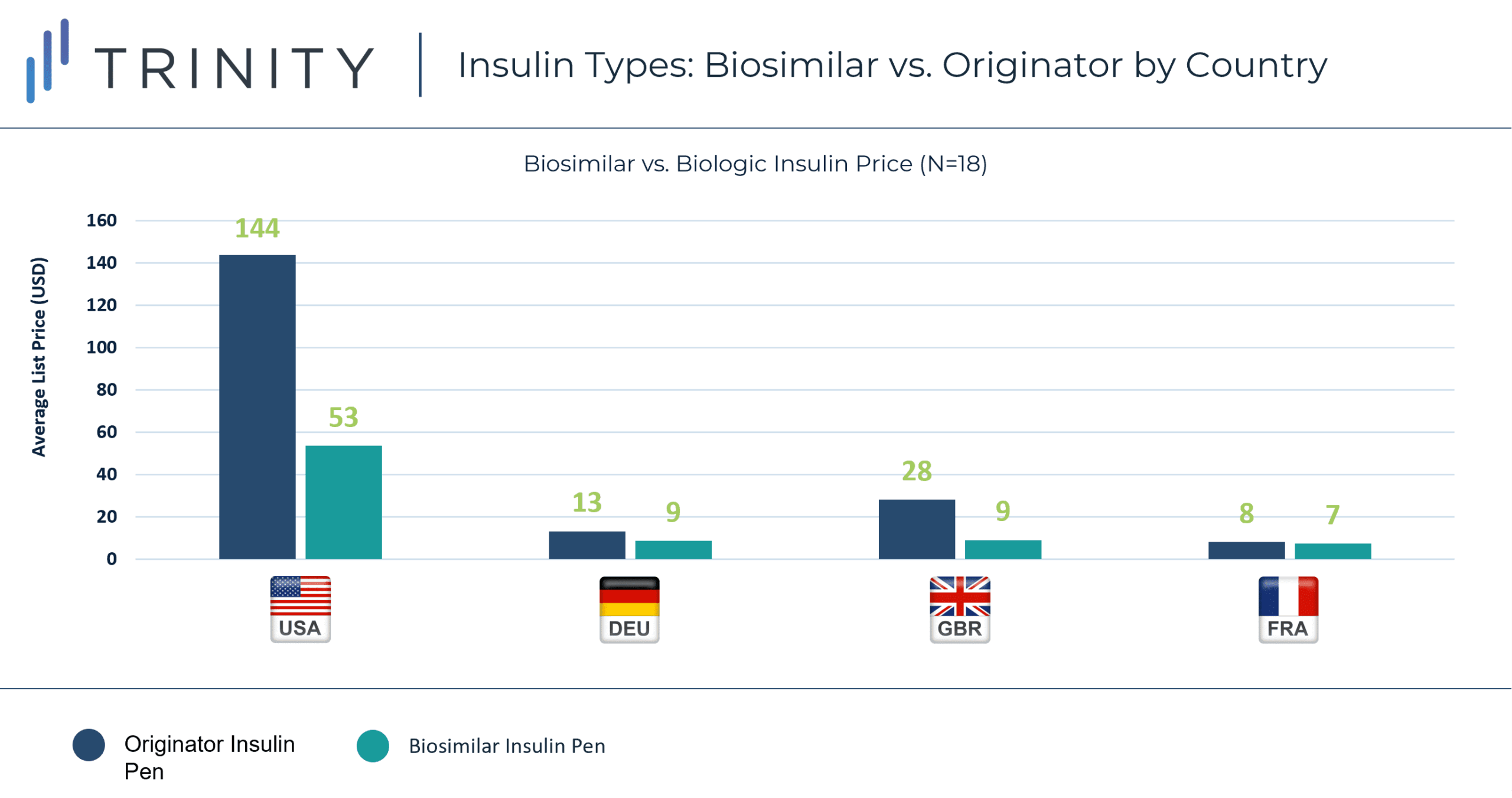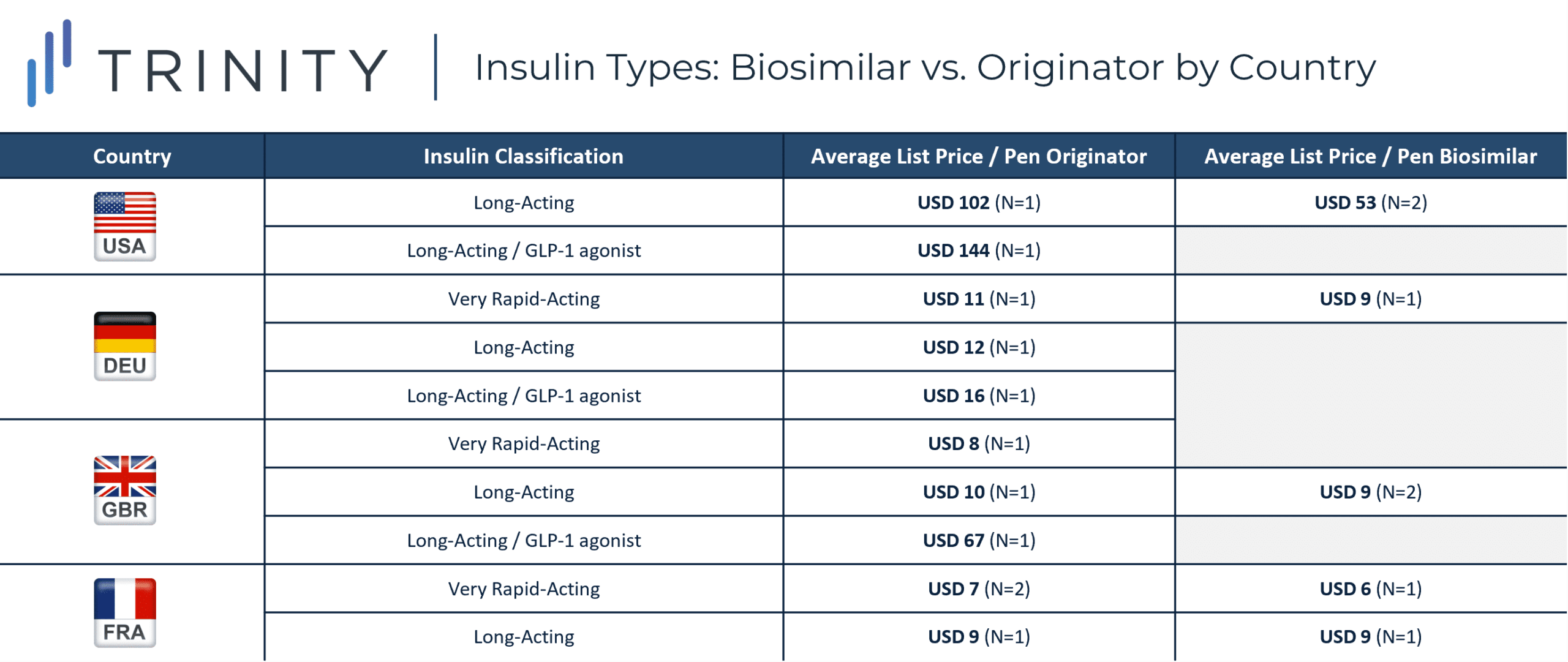 Trinity’s Take: All types of insulin products included in this analysis had significantly higher list prices in the USA vs. DEU, GBR, and FRA despite the availability of often equivalent products, brands, and technologies. While the only biosimilar insulin to be approved by the FDA through the new pathway had the lowest price nationally, the even lower price of Walmart’s private label insulin analog demonstrates biosimilars may not be the only competitor putting downward pressure on insulin prices in the USA.