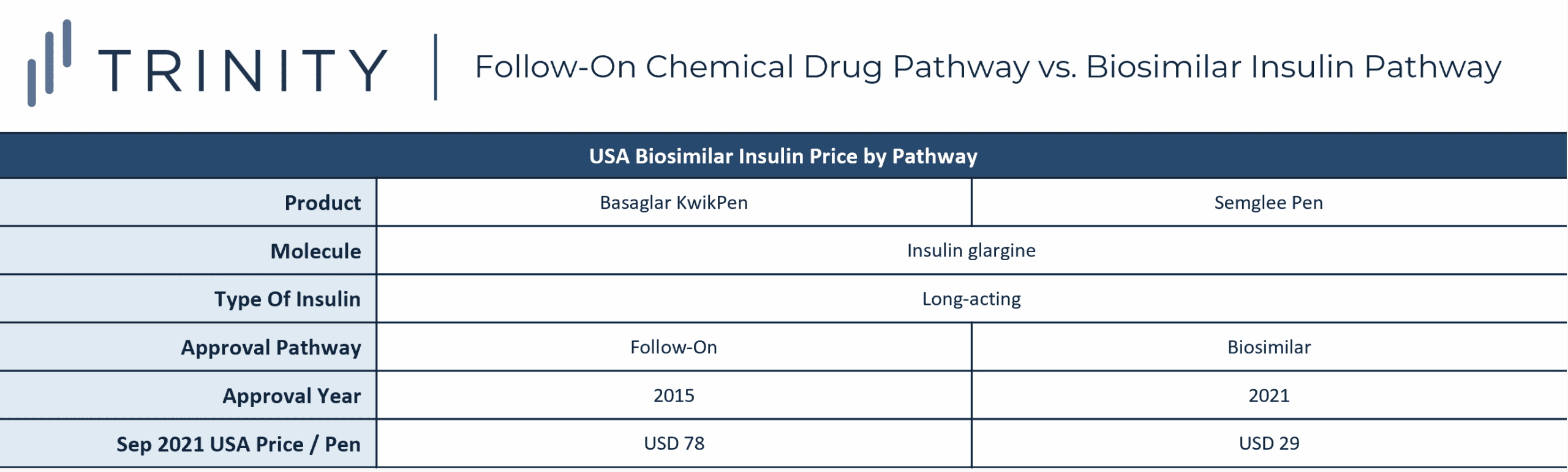 • The FDA approved the Semglee Pen (insulin glargine) as the first product through the new biosimilar insulin approval pathway in July 2021; the Semglee was priced as almost three times less costly in the USA than the previously approved biosimilar Basaglar KwikPen which was approved by the previous chemical add-on pathway