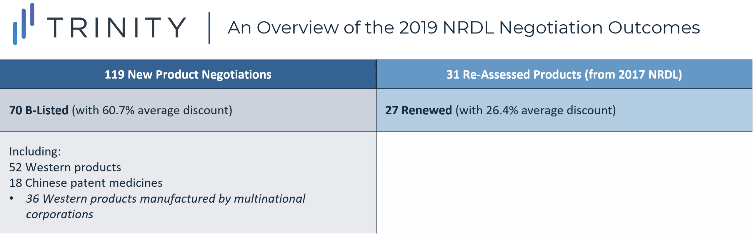 Trinity’s Take: The competitive landscape of the NRDL dictates the negotiation methods used, therefore tracking competitor situations, for both branded and generic products is crucial; furthermore, considering the NRDL ‘routine update’ pathway for an undifferentiated product in a crowded disease space and where payers accept the current NRDL price level, could avoid the need for price negotiations.