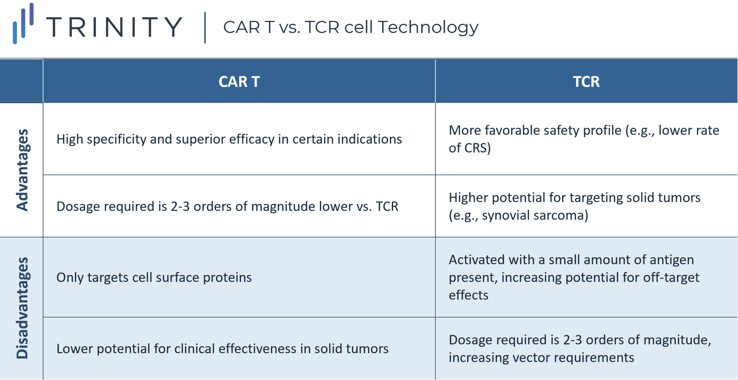 The safety profile of TCR T cell therapies has been demonstrated to be more tolerable when compared to CAR-Ts, given the lower rates of CRS. TCR T cell therapies are in development for several different solid tumor types, including metastatic melanoma, synovial cell sarcoma, multiple myeloma, and esophageal cancer, given their ability to target proteins unique to specific tumors driven by intracellular protein recognition. Leading companies in this space include: Adaptimmune, Medigene, and KitePharma.