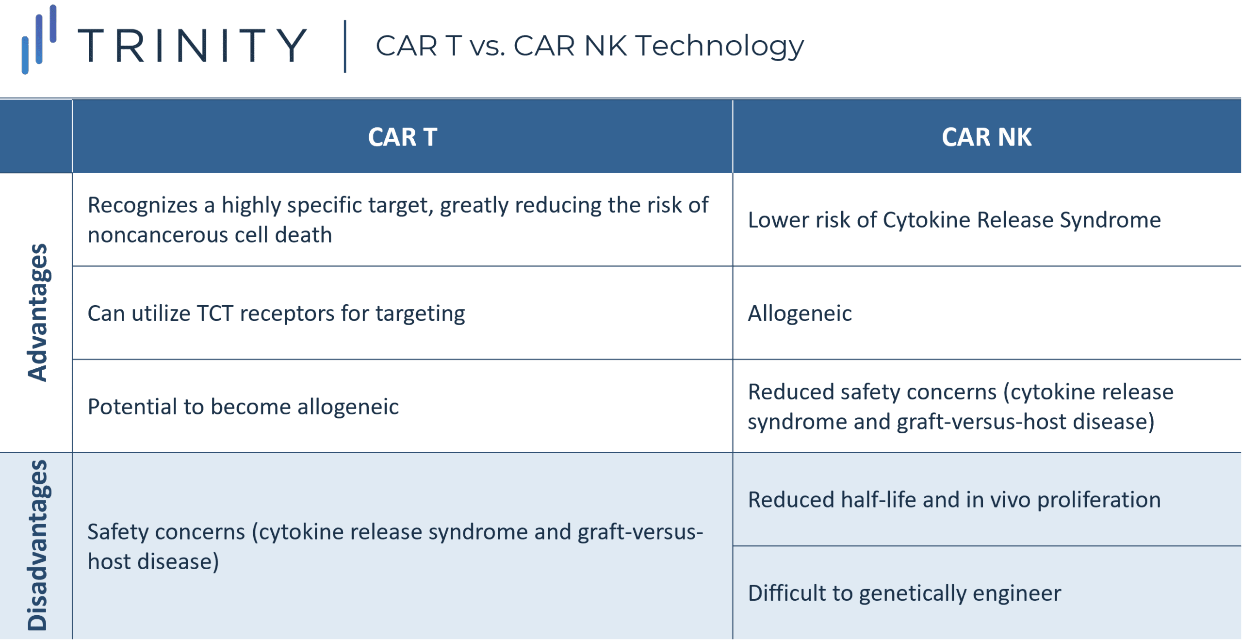 Unlike T cells, NK cells do not require strict human leukocyte antigen (HLA) matching, eliminating the risk of GvHD. This means NK cells are naturally allogeneic and would be available as off-the-shelf products. In addition, NK cells have a decreased likelihood of causing CRS given they release different cytokines vs. T cells (that mainly produce proinflammatory cytokines) and NK cells do not undergo clonal expansion.